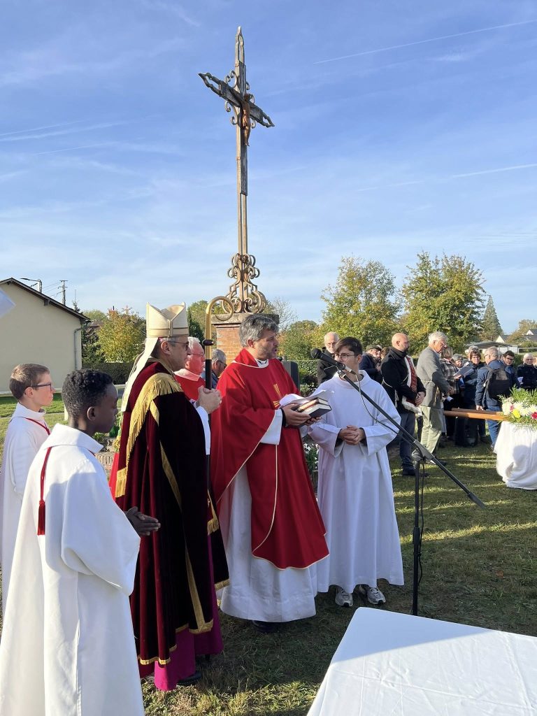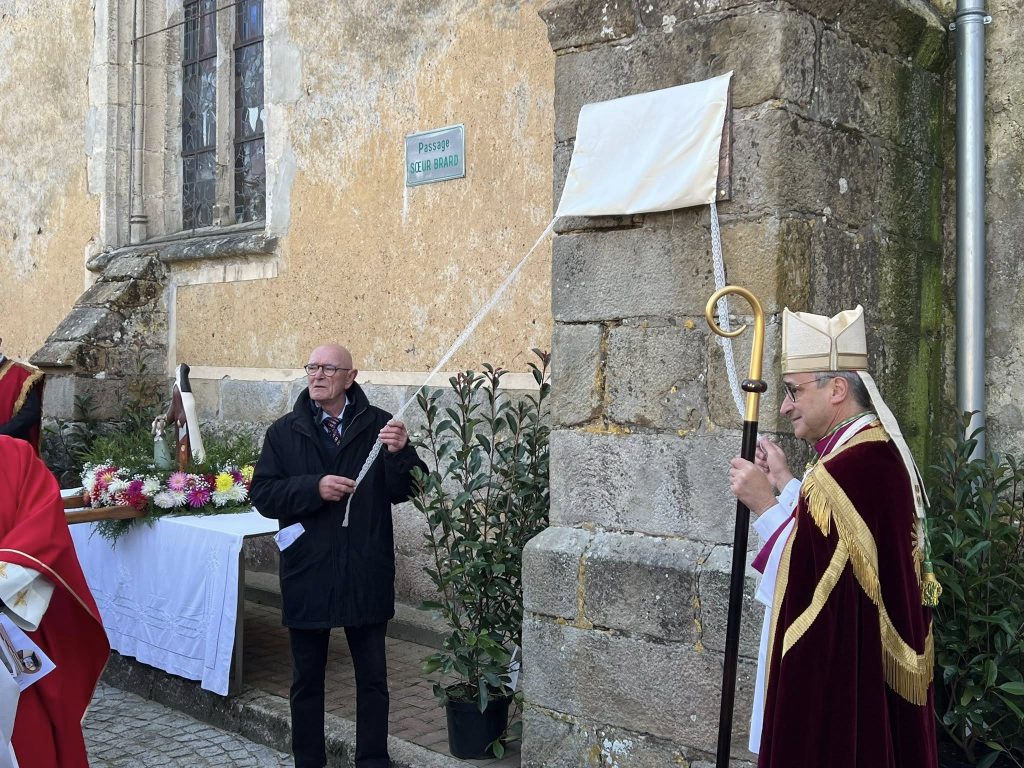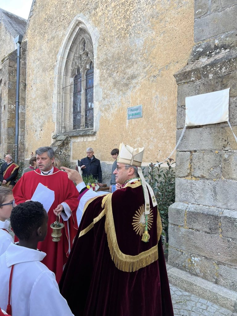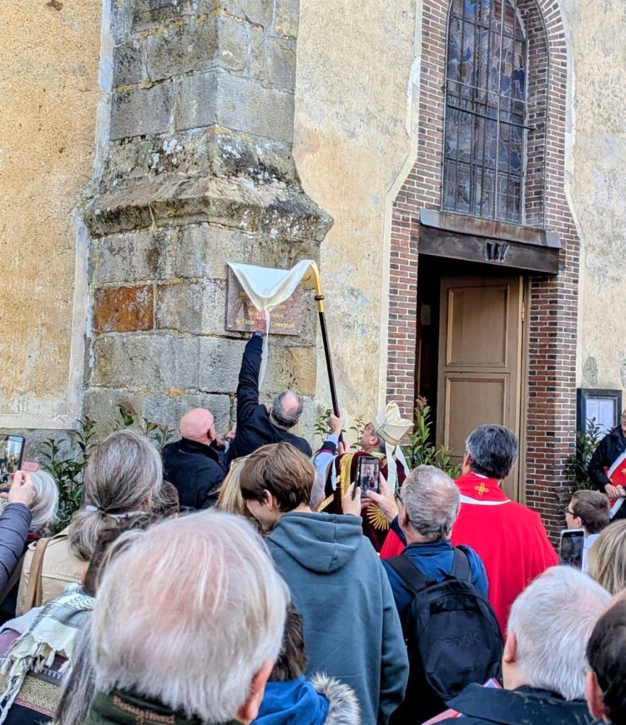 Devant l’église, une plaque commémorative a été bénie en présence de Mgr Olivier de Cagny et de M. le Maire de Bourth.